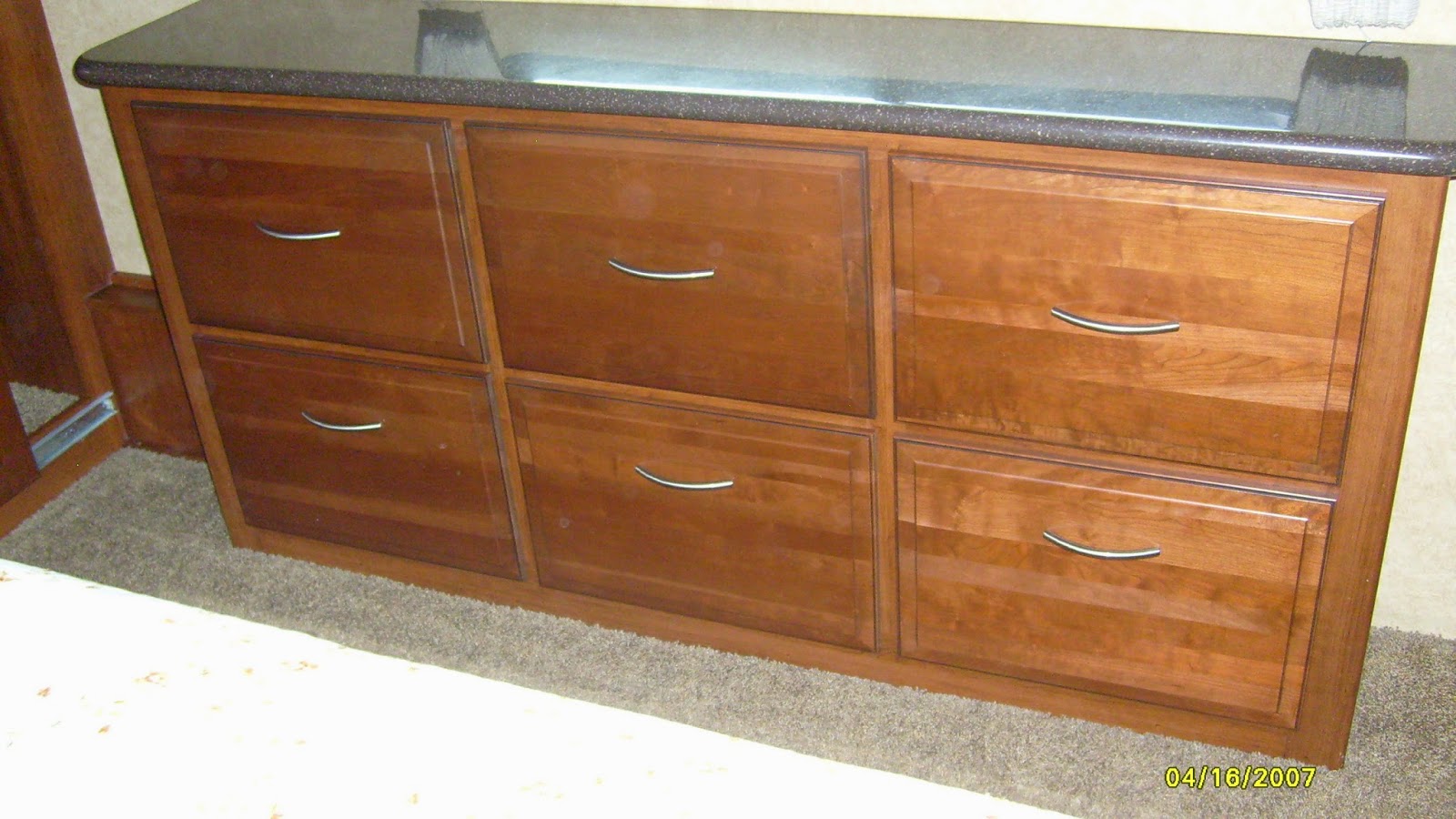 In one of the slide outs there is a private desk area with internet hookups. Also adjacent to the desk area is an electric fireplace with the option to have the flames on but the heat off to enjoy the fireside ambiance. Just above it is a flat screen LCD television.